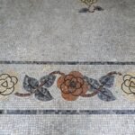 L’ampli vestíbul té el terra decorat amb un gran mosaic de tessel·les amb motius florals i les parets i sostre amb figures geomètriques. Un arc deprimit còncau separa la zona del vestíbul de l’escala.