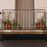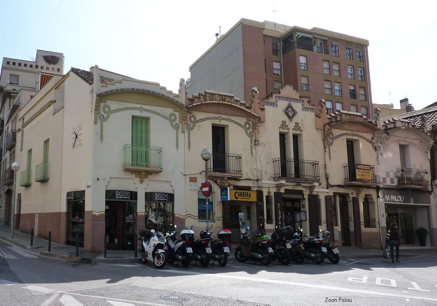 Les edificacions dels dos costats són molt similars entre si. Disposen d’obertures comercials amb capçals esglaonats i finestra a peu de carrer. A la primera planta tenen una obertura simple amb balcó individual, coronat per un esgrafiat de motiu vegetal, amb forma de garlanda. La cornisa segueix la forma d’un arc carpanell molt rebaixat, amb mosaic de colors a les vores, que trenca amb l’estil de la coronació esglaonada.