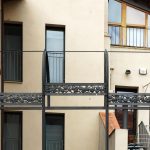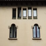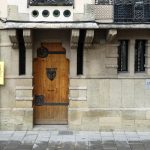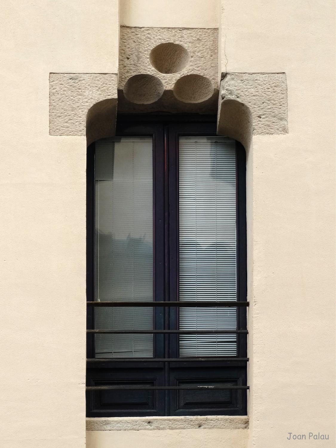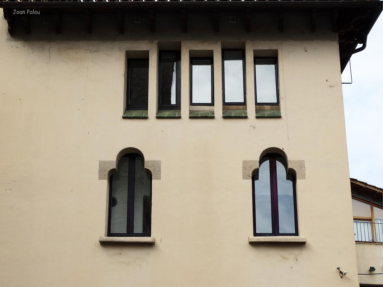 La planta baja está recubierta con piedra desgastada y el resto de la fachada está revocada en blanco. Como hará en otras viviendas de los primeros años, Pericas sitúa la puerta principal a un lado, rompiendo la simetría de la fachada.