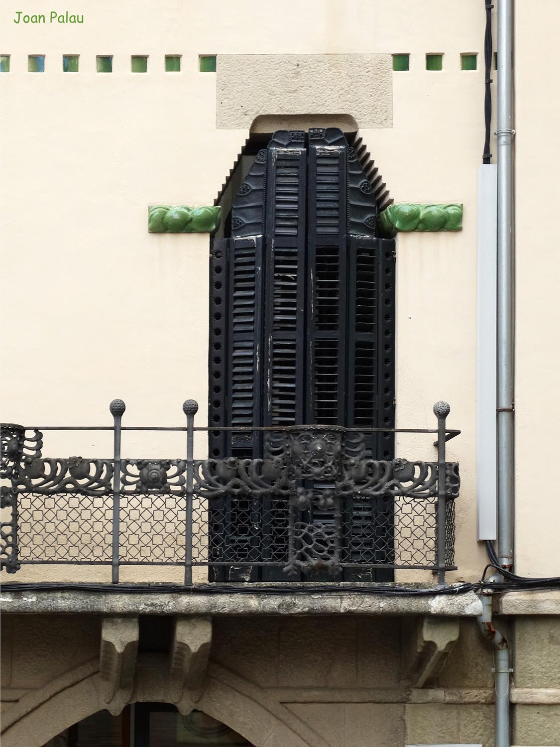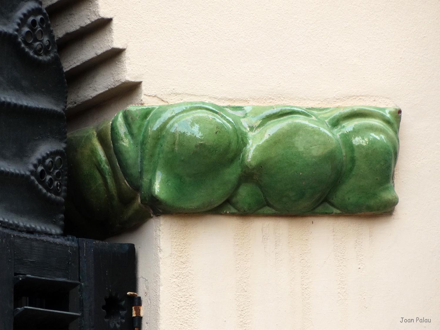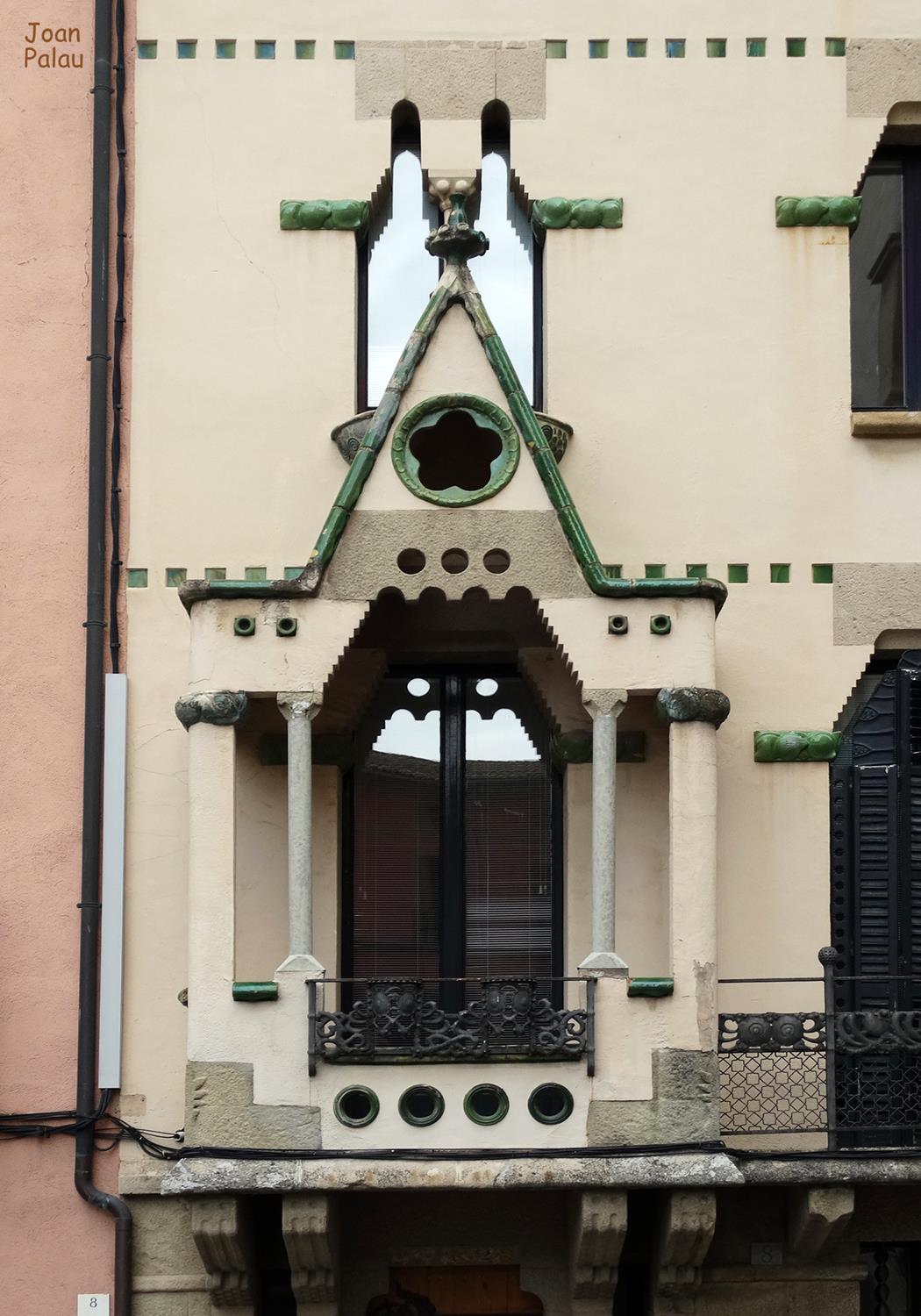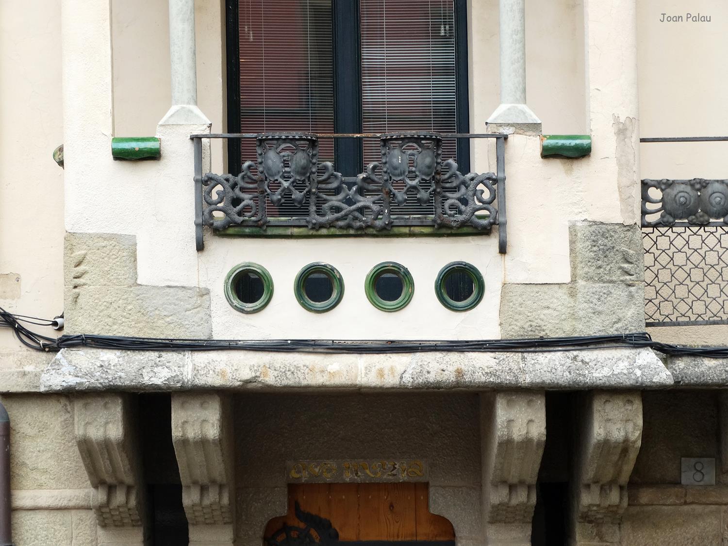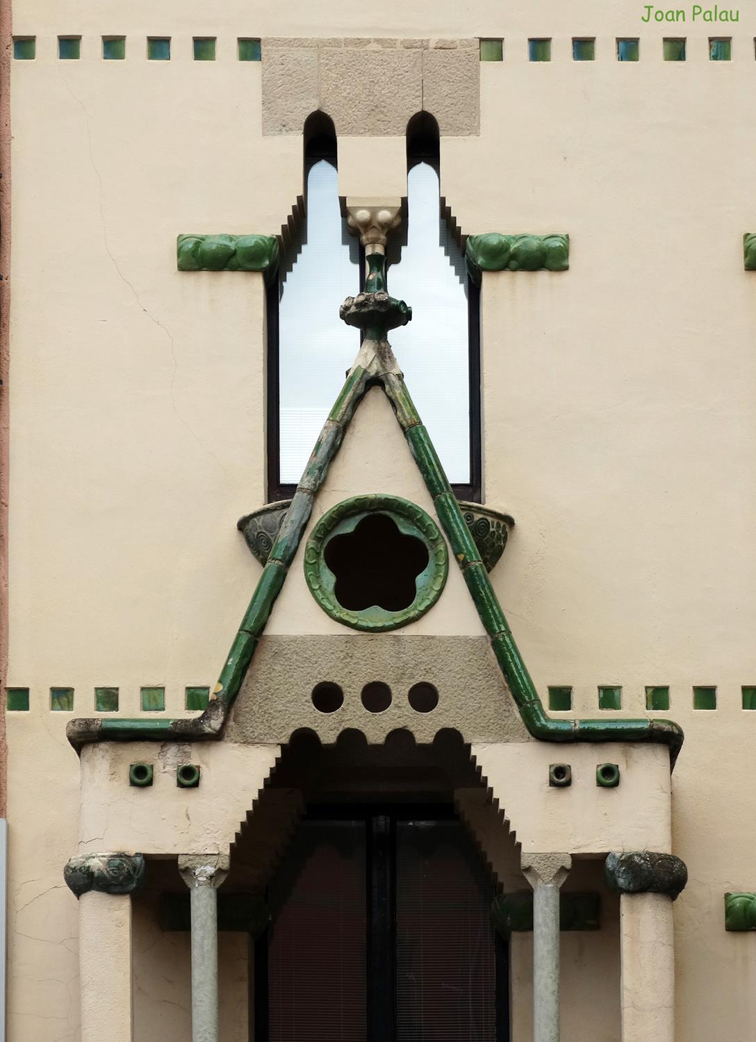 El edificio destaca por la tribuna decorada que se encuentra en el balcón del primer piso, la barandilla de hierro forjado del balcón corrido, las ventanas de formas irregulares y decrecientes en función de la altura y los elementos de cerámica verde distribuidos a lo largo de la fachada.