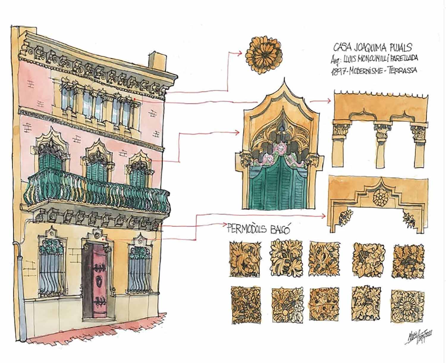 – Fachadas: La fachada principal es de piedra lisa en planta baja y de obra vista el resto, siguiendo un esquema de composición simétrica. En la planta baja encontramos el portal y dos ventanas laterales con un dintel de piedra artificial dibujando un arco de cortina central con una flor en su interior. Las jambas de las ventanas culminan con un capitel de motivos vegetales. Sobre las aberturas de la planta baja podemos apreciar unos canecillos con hojas de hiedra, palmíferas lobuladas y reproducciones de frutas, unidas por una cadena de hojas de hiedra. En el piso principal encontramos tres aberturas unidas por un gran balcón y cubiertas por arcos polilobulados que enmarcan paneles de cerámica vidriada y en el piso superior, una galería de tres ventanas de inspiración neogótica. El alero está rematado por una balaustrada de clavos.