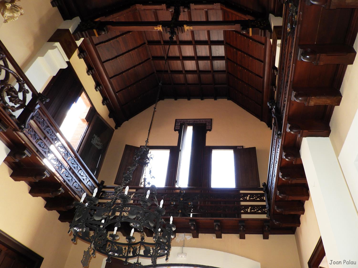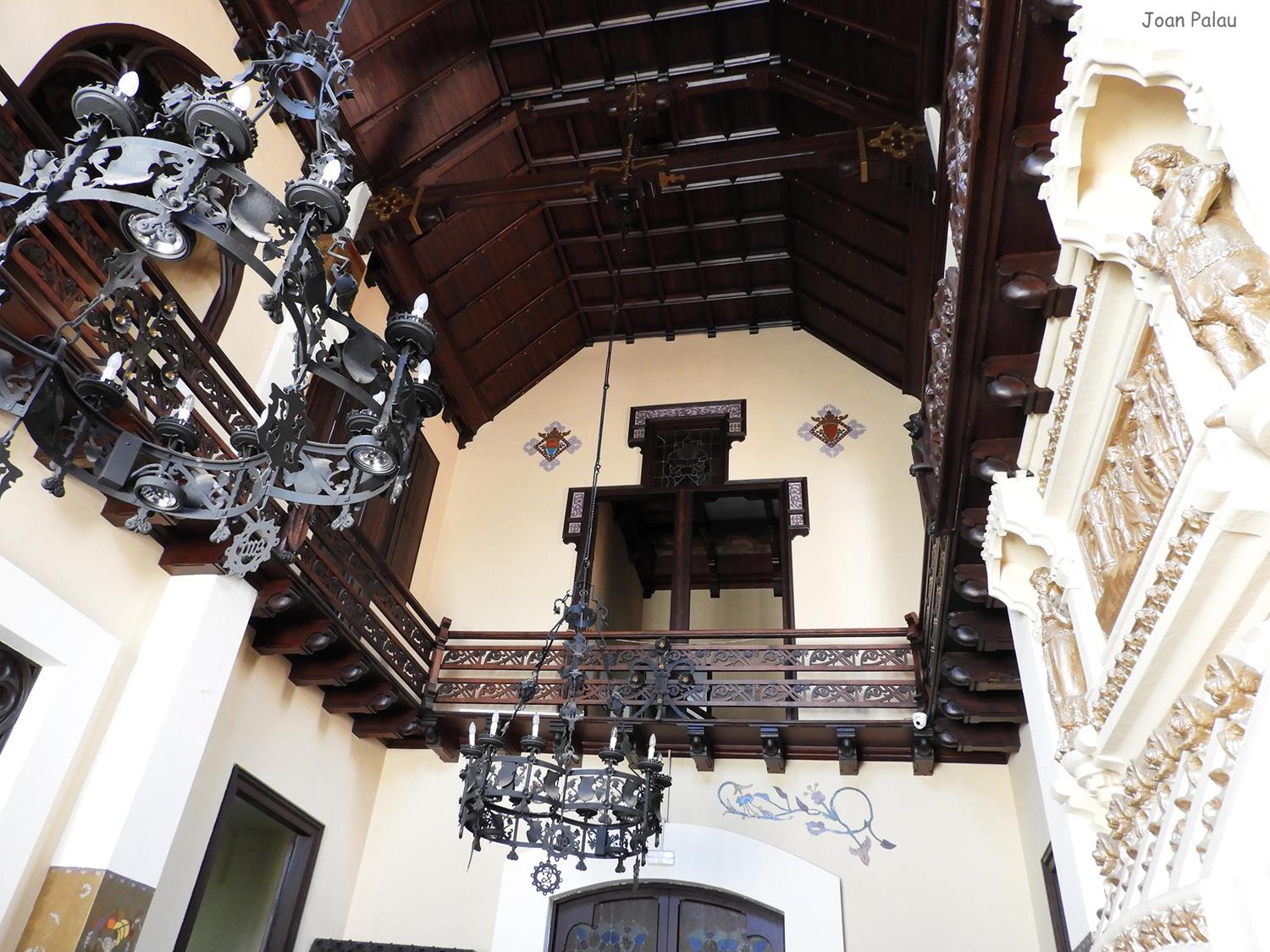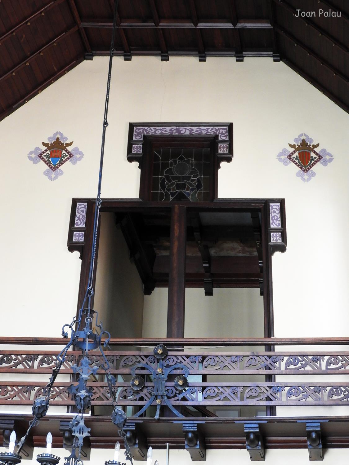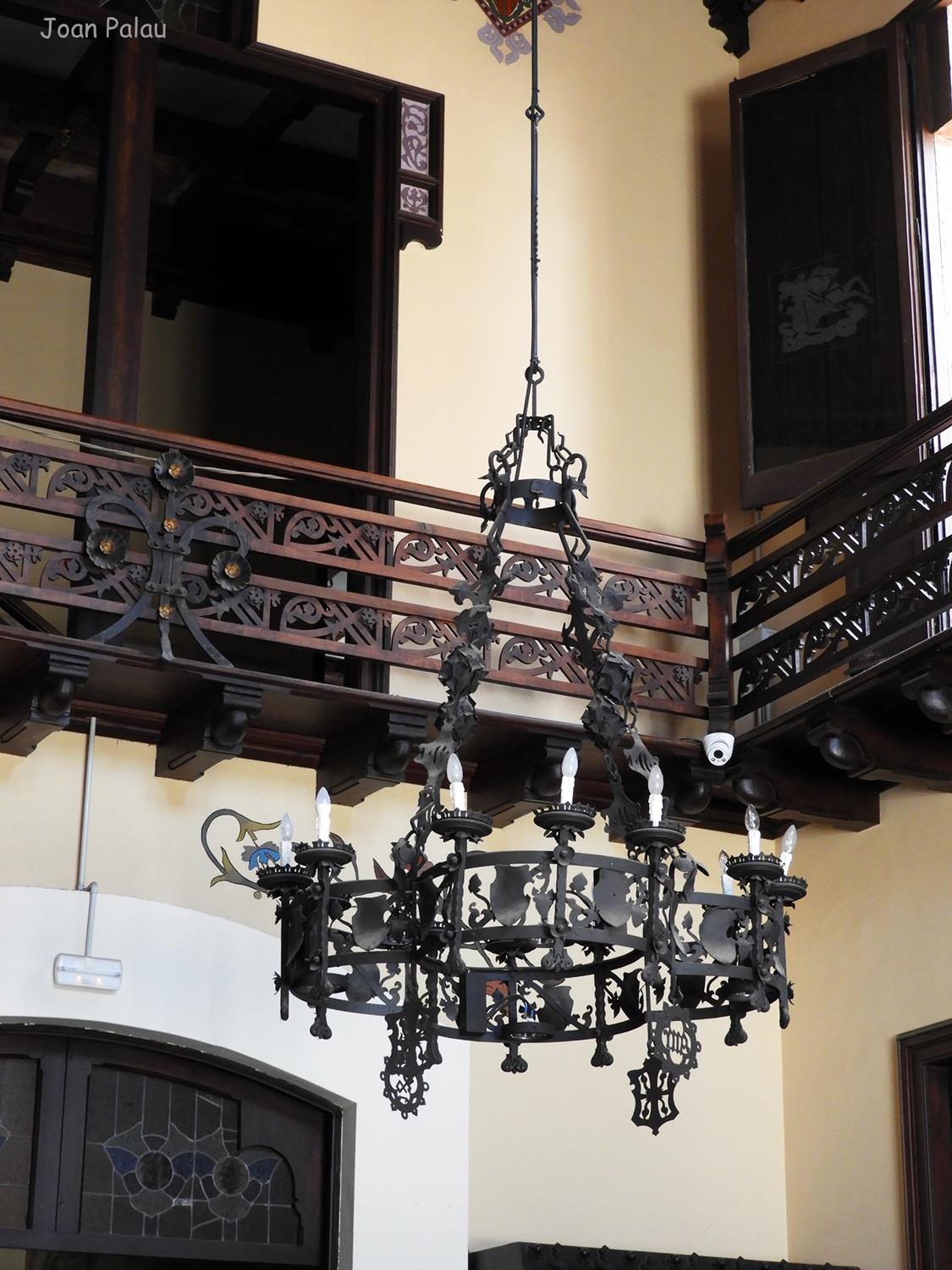 Además son destacables los trabajos de forja de las lámparas y faroles, las cristaleras de colores y la ebanistería del techo.