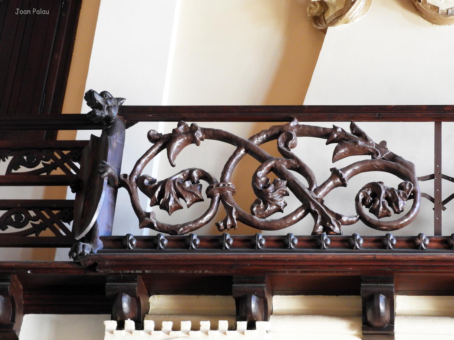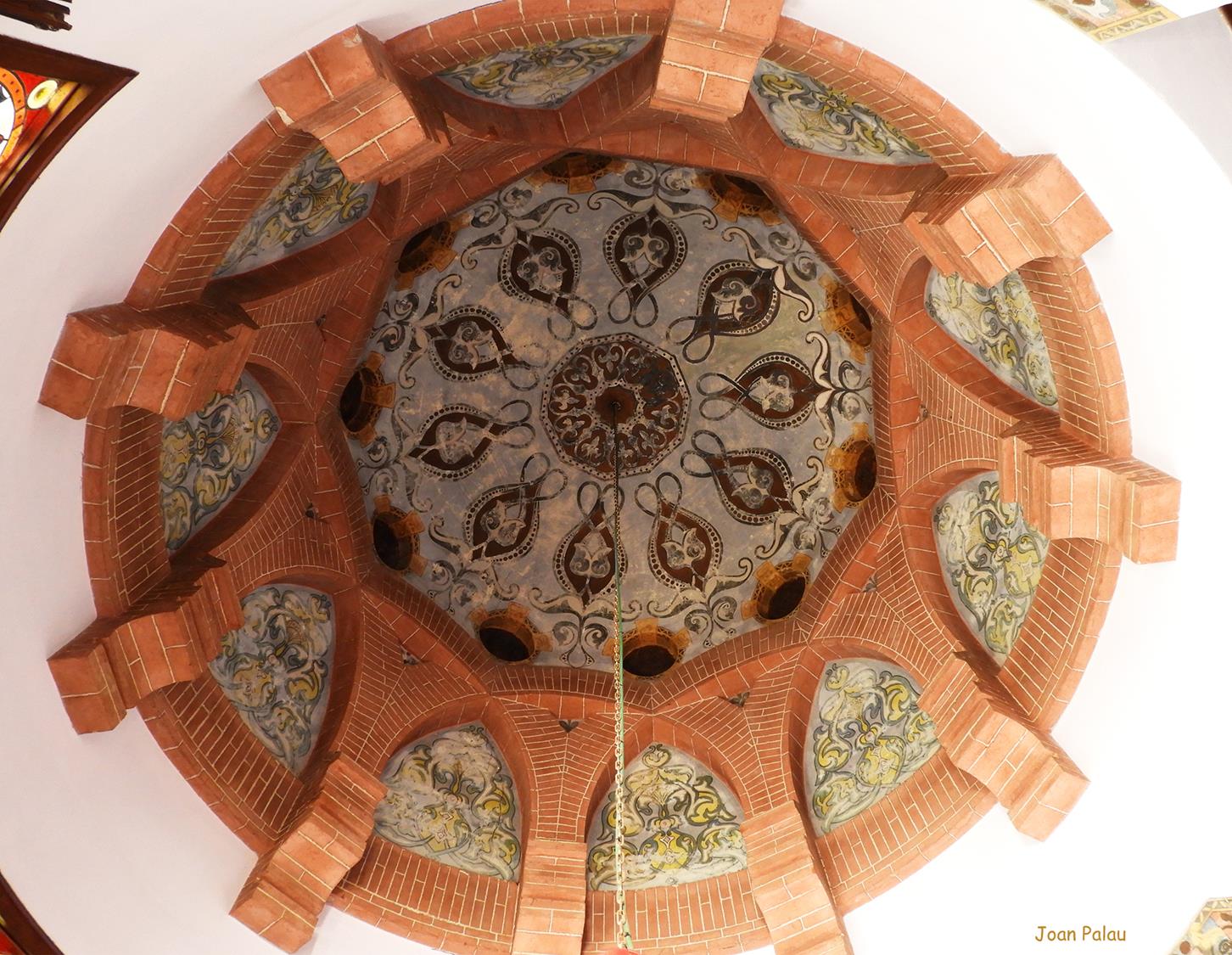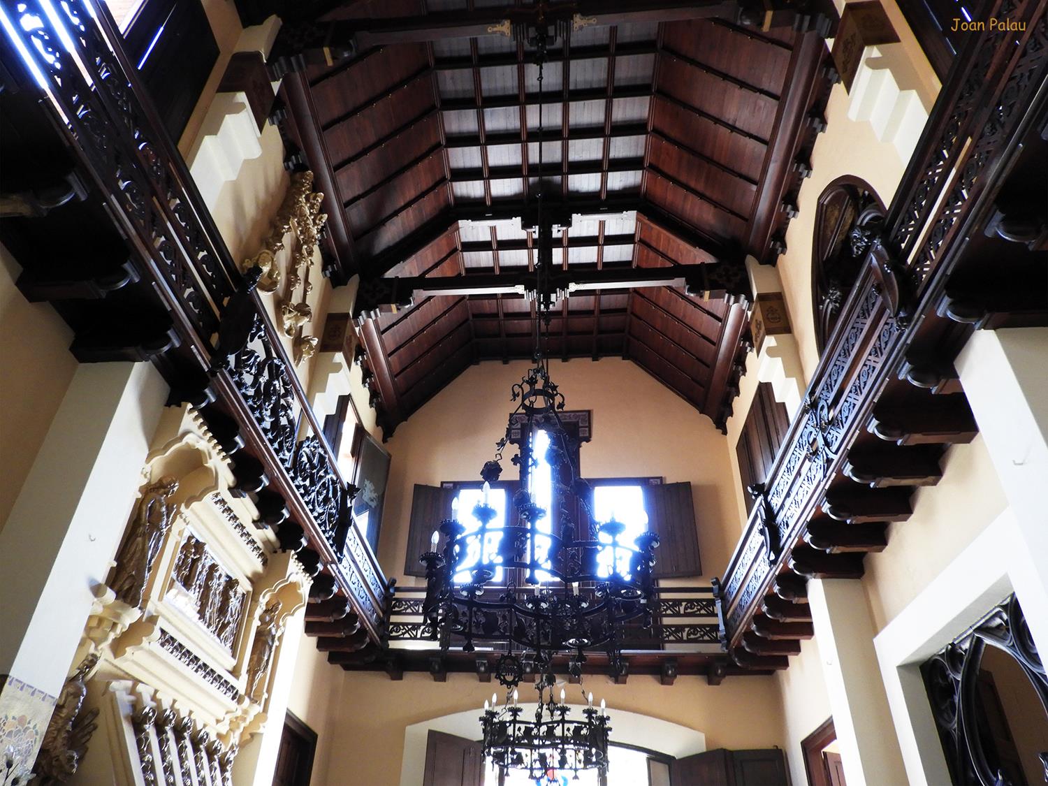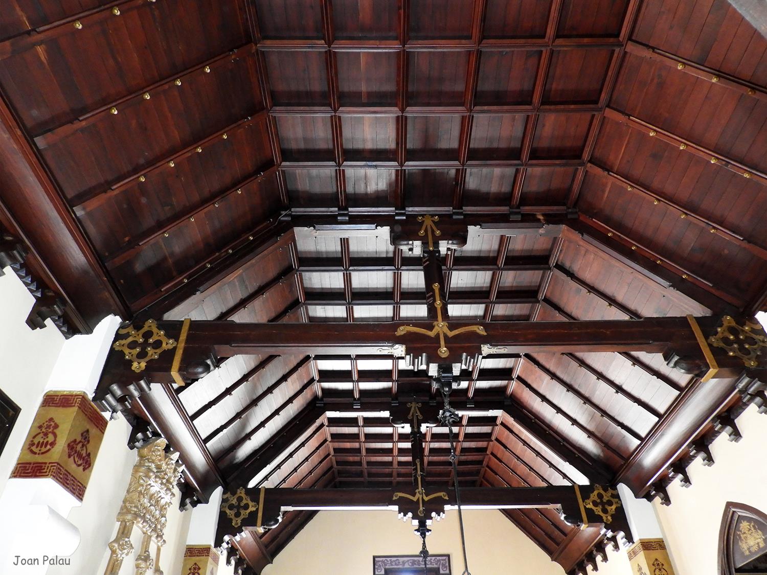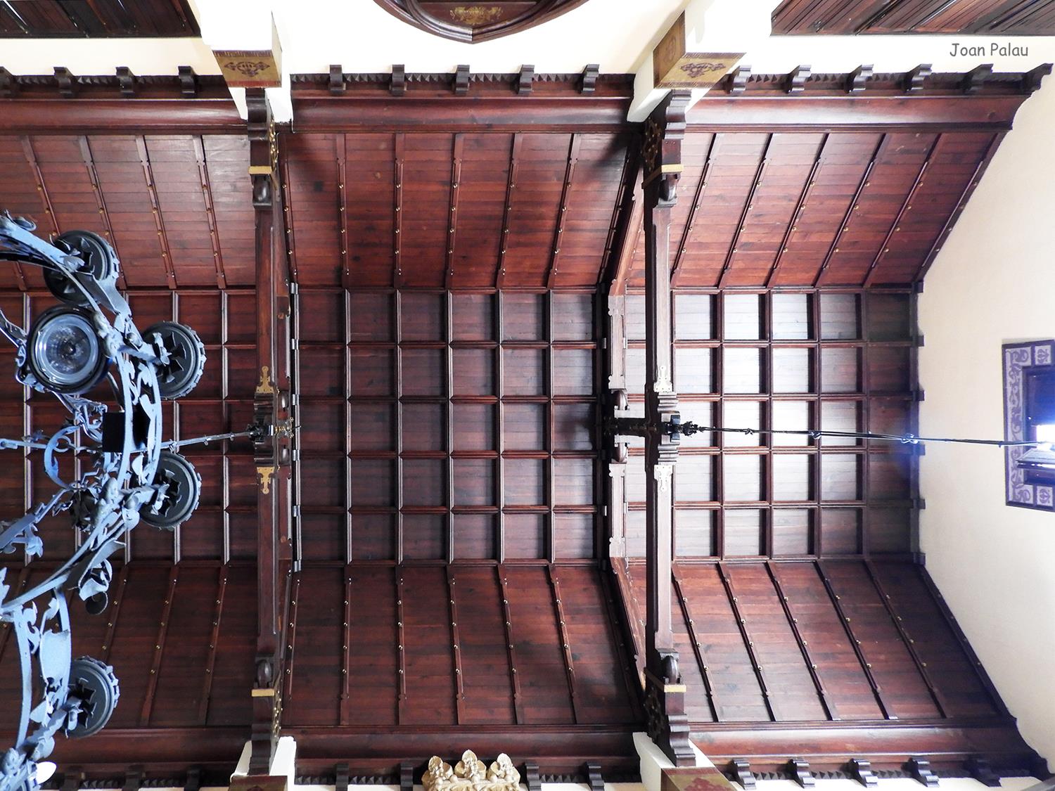 Además son destacables los trabajos de forja de las lámparas y faroles, las cristaleras de colores y la ebanistería del techo.