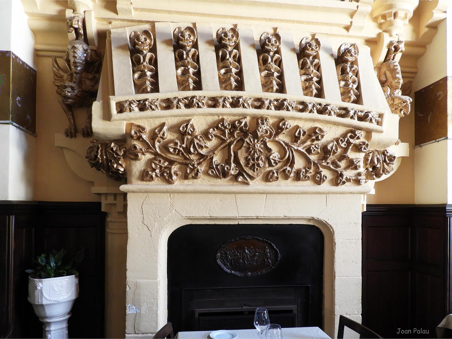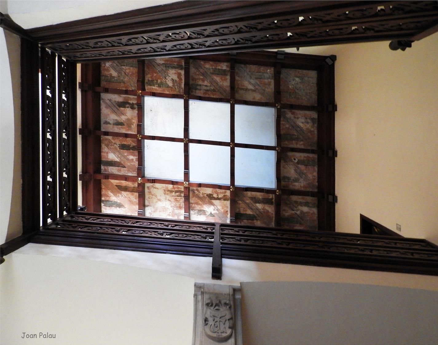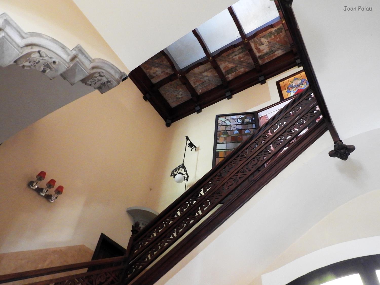 Del interior del edificio cabe destacar en la planta baja, el recibidor, el mirador redondo de la torre y especialmente el gran salón, con el mosaico de teselas con escenas de caza, elementos geométricos y una representación del tetramorfo. El salón principal ostenta toda la altura del edificio y esto permite dar más relieve a la gran chimenea de la sala, que cuenta con tres bustos (seguramente corresponden a los tres hijos que tuvo el matrimonio), diferentes elementos florales y un alto relieve del descubrimiento de América (la terminación de la casa coincide con el 400 aniversario del descubrimiento de América, 1492-1892).