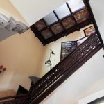 Al primer piso se accede por una escalera de mármol, que tiene una barandilla de madera trabajada, que también encontramos en el balcón corrido que bordea todo el salón principal de la casa. Esta planta cuenta con cuatro habitaciones, para el matrimonio y sus tres hijos. Dos tienen salida a la fachada principal y las otras dos a las terrazas laterales del edificio.