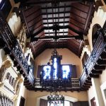 El interior del edificio destaca por el cuidado trabajo de ebanistería, los mosaicos originales de teselas, las vidrieras de colores y la gran chimenea del salón principal con una alegoría al descubrimiento de América.