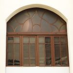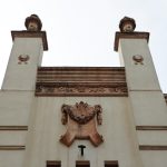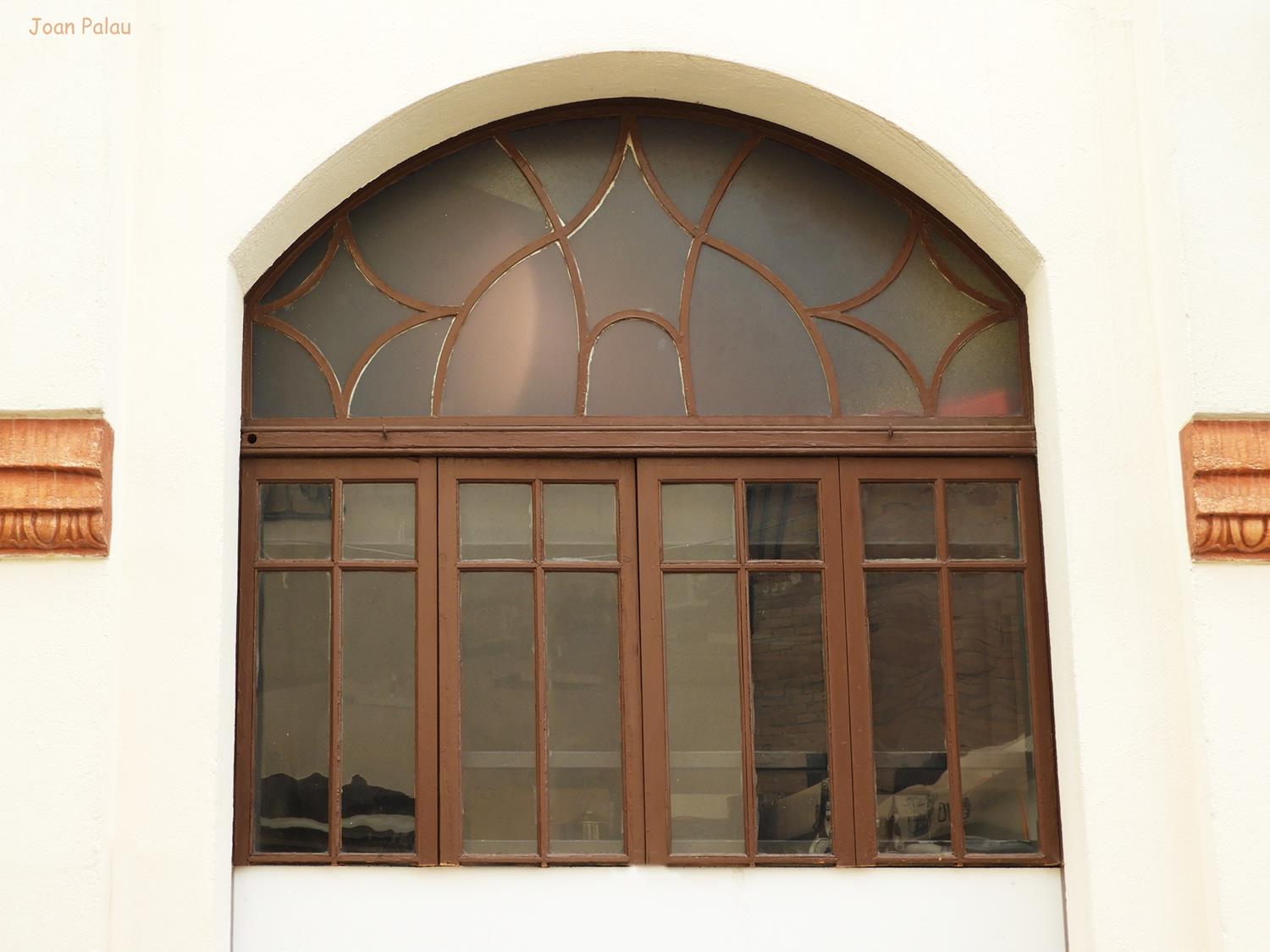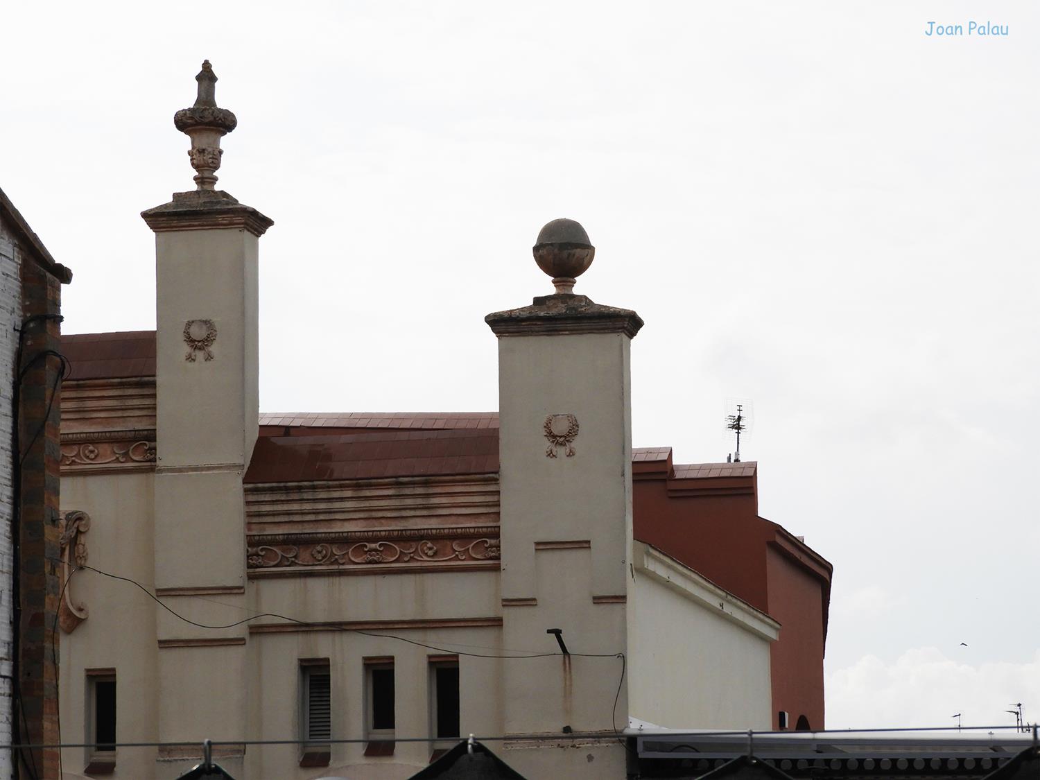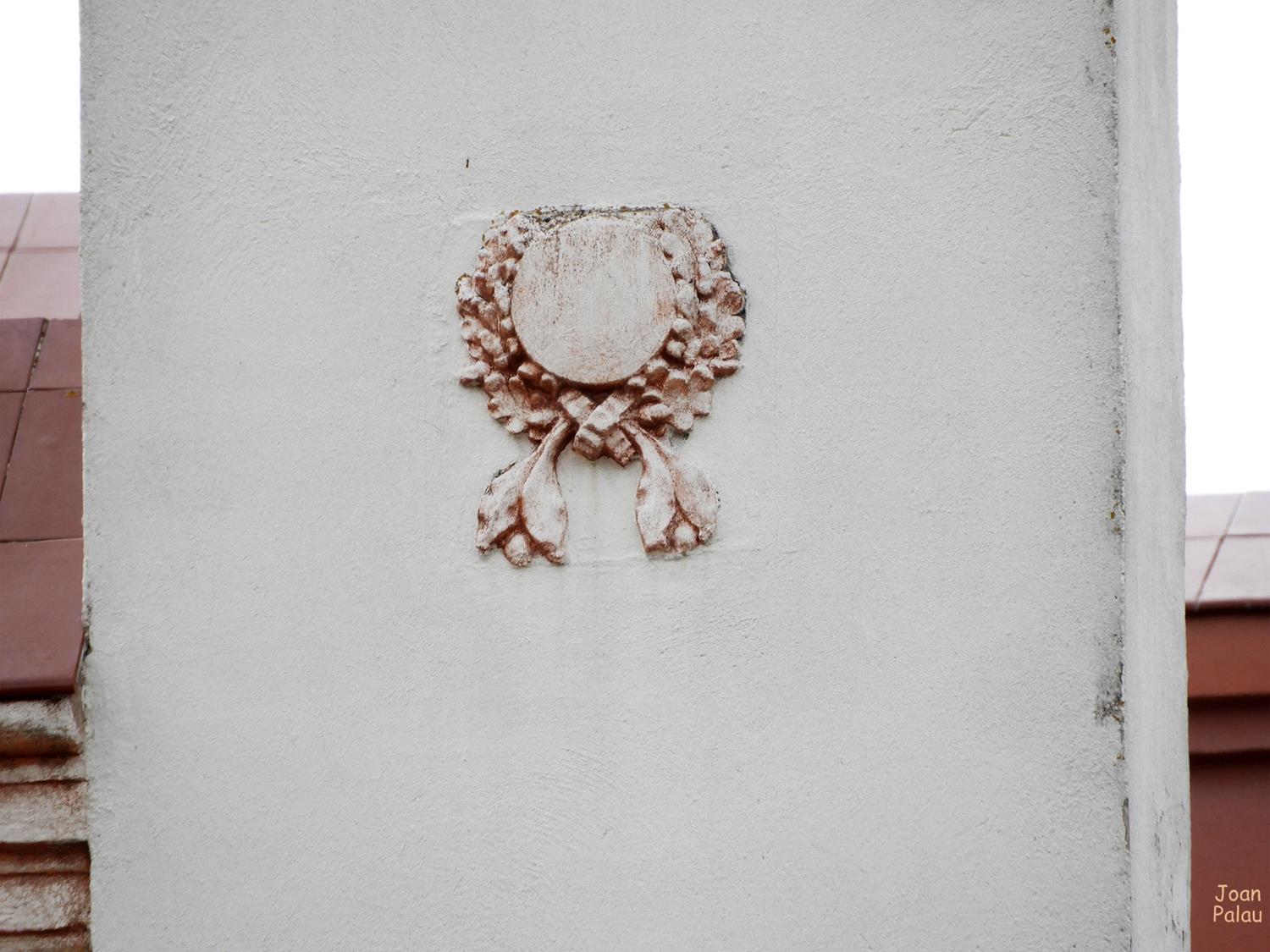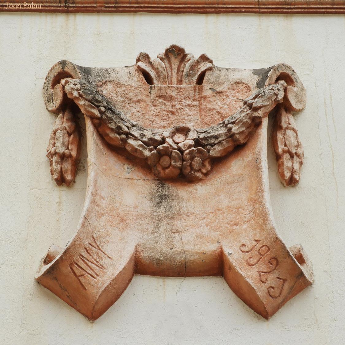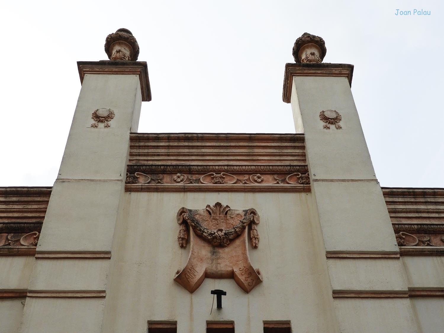 Destaca la decoración de la fachada principal, distribuida entre franjas verticales, a base de molduras y elementos florales de terracota, en una estructura simétrica.
