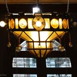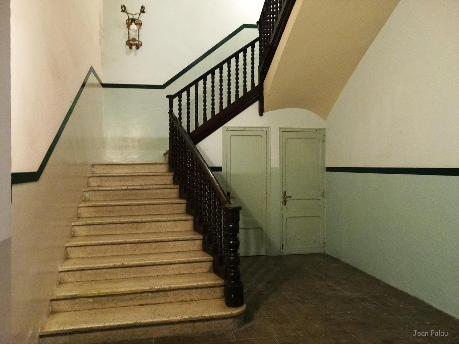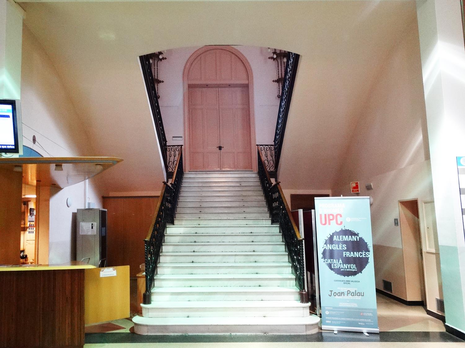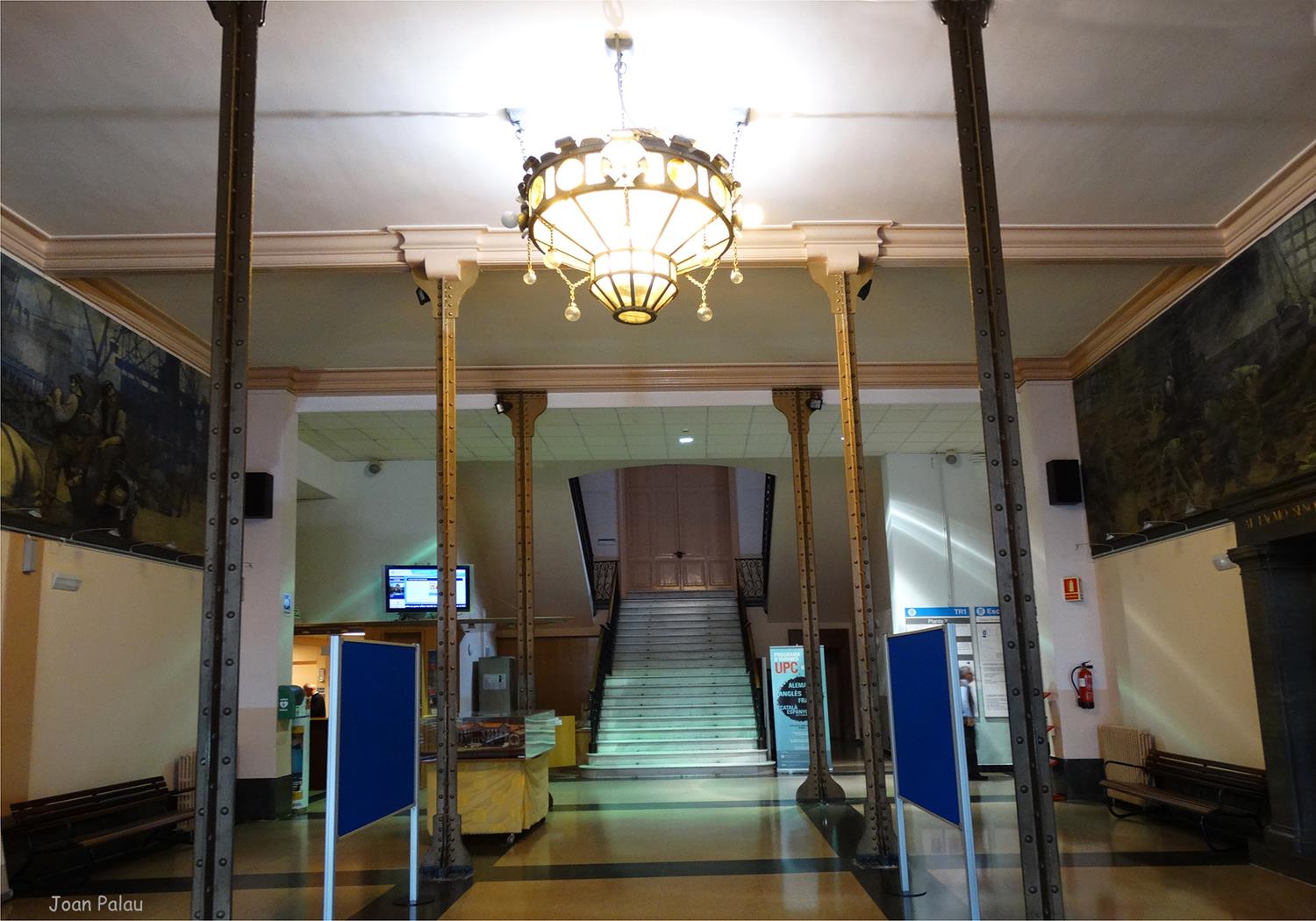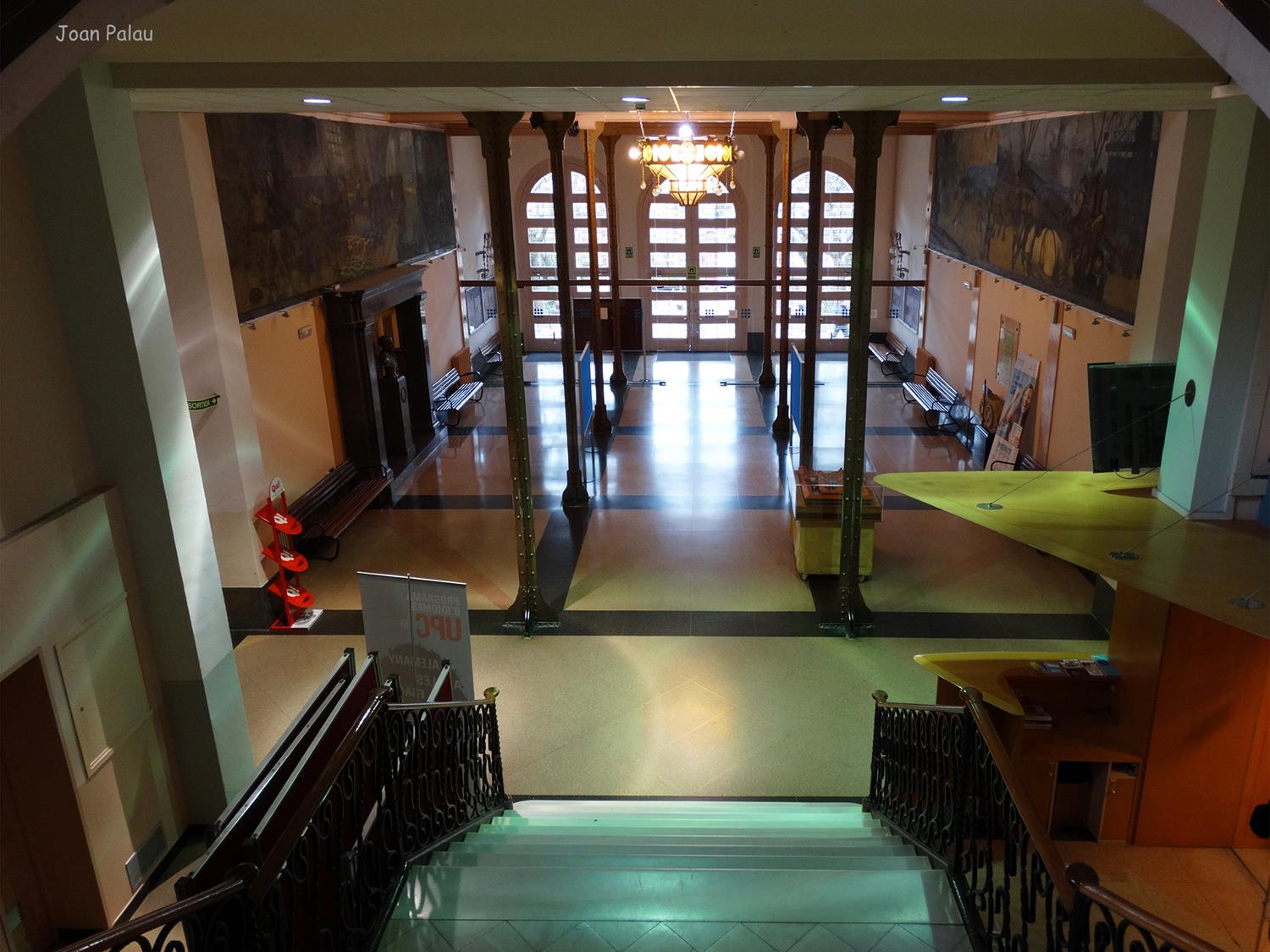 El vestíbulo central, que da acceso a las aulas y dependencias como la biblioteca, está sustentado por columnas de hierro forjado y decorado por dos grandes pinturas en forma de friso, obra del pintor Pere Viver i Aymerich, uno dedicado a la industria textil y el otro al comercio. Del centro del techo cuelga una gran lámpara circular con cristales amarillos. Una escalera central, con barandillas y faroles de hierro forjado, lleva al primer piso, donde destaca el vitral con la alegoría de la industria. La escalera, con formas más sencillas, sigue ascendiendo a otras dependencias, donde destacan los suelos.