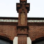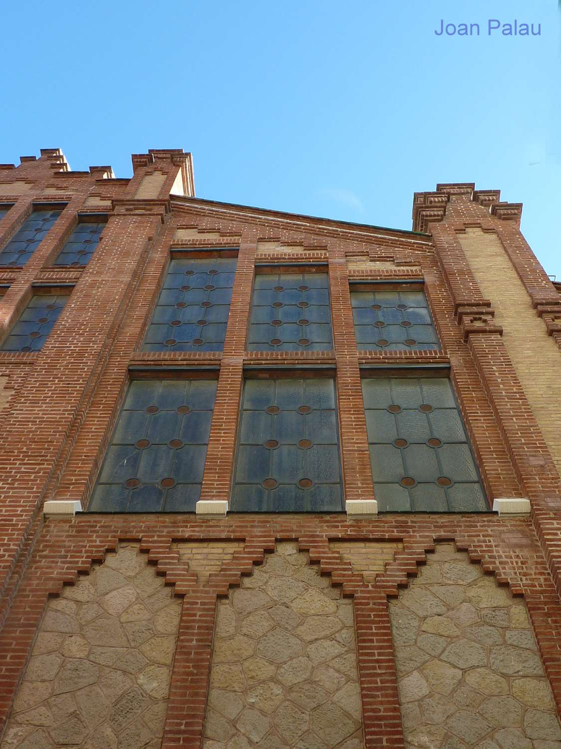 Edificio de planta longitudinal de tres naves, con los muros de obra vista, donde predomina el ladrillo rojo y ocre combinado con la piedra y la cerámica. La fachada principal viene definida por el perfil de las cubiertas, con cuerpo central y dos laterales; presenta una sucesión de pilastras que ordenan las aberturas y que siguen por encima del nivel de la cubierta con pináculos, rompiendo la horizontalidad del edificio. Un friso de baldosas cerámicas con motivos florales esquemáticos, recorre todo el largo de la fachada. Estructura similar en las fachada lateral y trasera, con ventanales en arco rebajado subdivididos en tres partes. Cuenta con tres cubiertas: la central con un cuerpo a dos aguas y las dos laterales con una vertiente.
