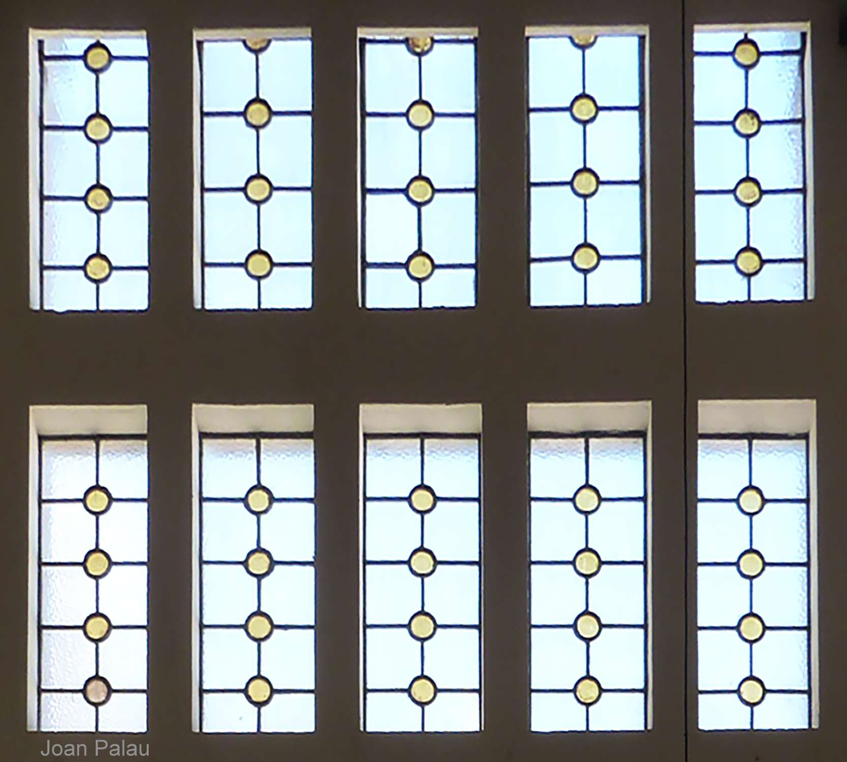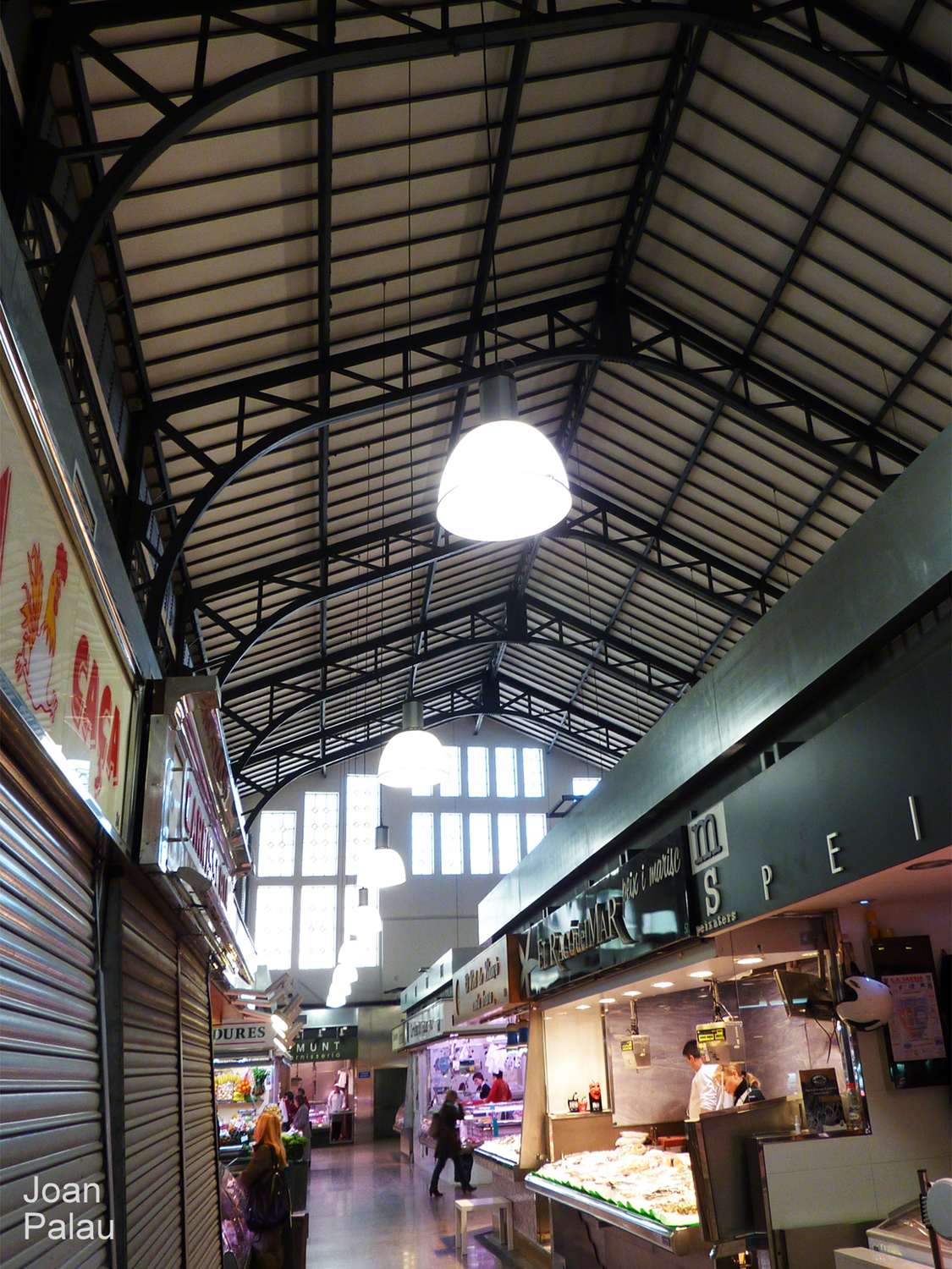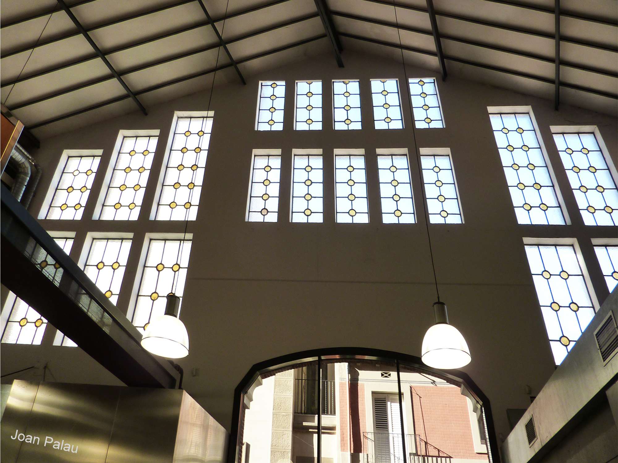 Interiormente, una estructura formada por una cercha de perfiles laminados, apoyada sobre pilares de fundición, permite un espacio diáfano y los grandes ventanales acristalados permiten la entrada de luz diáfana.
