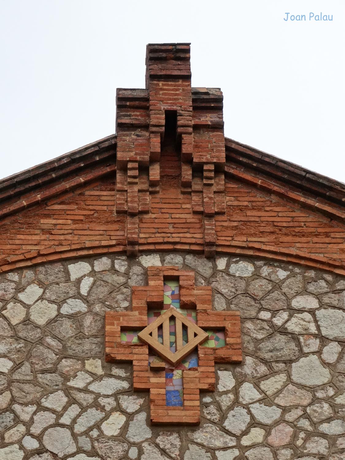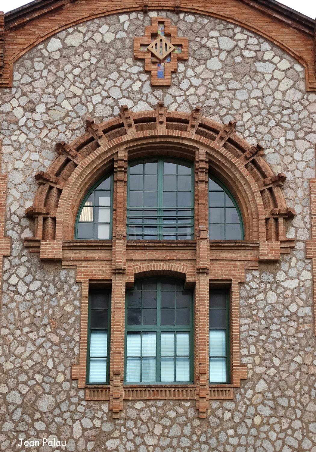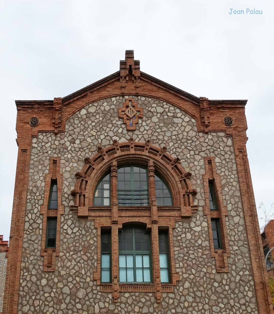 En esta fachada de mampostería enmarcada por ladrillo visto, destacan: la apertura en arco de semicírculo de ladrillo visto y dividido en tres ventanas por dos columnas de ladrillo visto y dos aberturas estrechas y verticales a ambos lados y por debajo, otra abertura dividida en tres ventanas por dos columnas de obra vista, la central más grande en arco rebajado y las laterales rectangulares con las jambas de obra vista. Por encima de todo, un escudo de Cataluña y más arriba un arco de ladrillo semicircular rebajado sostiene la cornisa moldurada de ladrillo visto. La cubierta del edificio está a dos aguas.